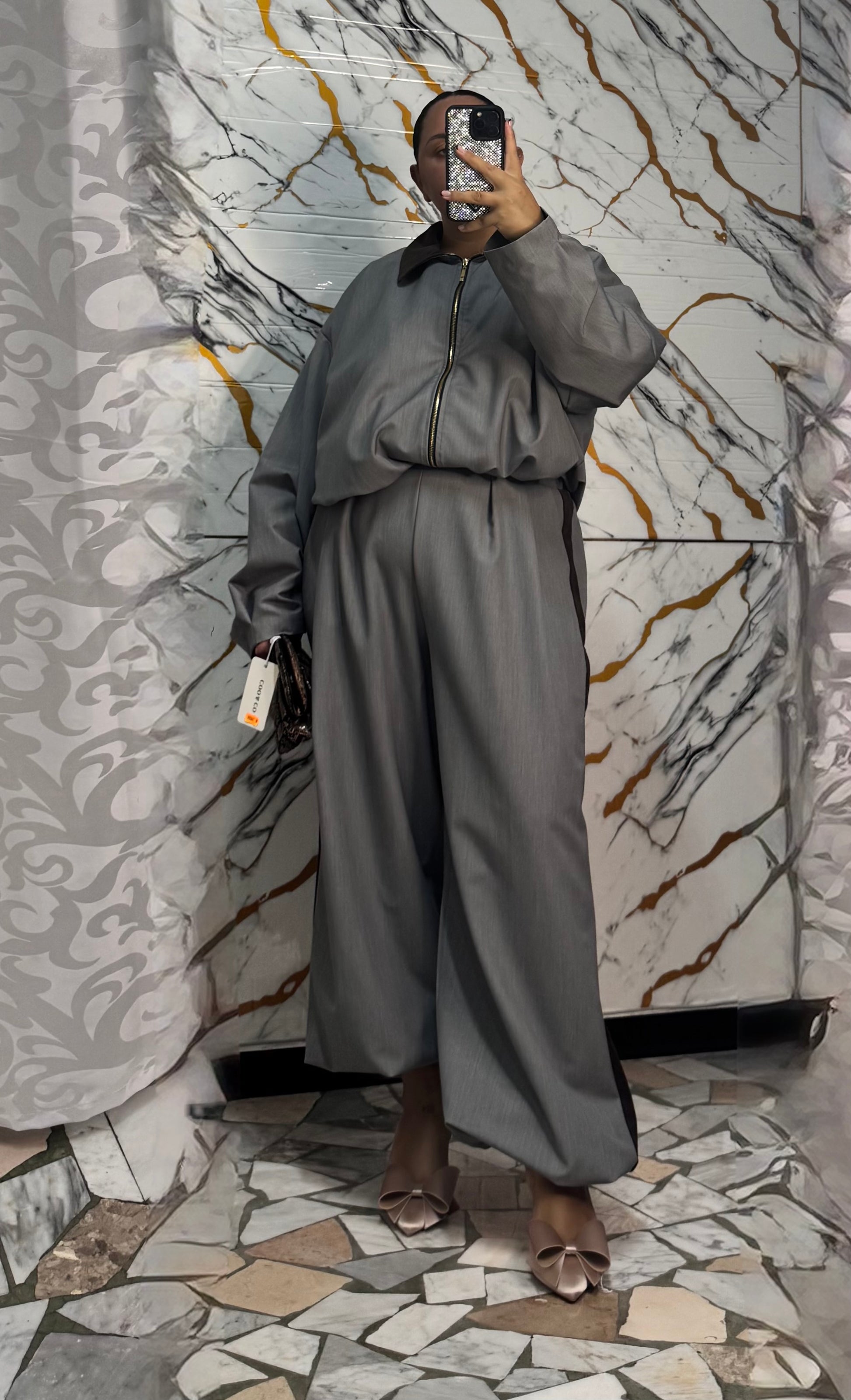 Un completo elegante e confortevole, pensato per valorizzare le forme con stile. La blusa oversize con zip frontale è impreziosita da un colletto che riprende le stesse linee laterali del pantalone, creando un raffinato gioco di richiami. Il pantalone a palazzo ha una vestibilità morbida e fluida, perfetta per garantire libertà di movimento senza rinunciare all’eleganza.