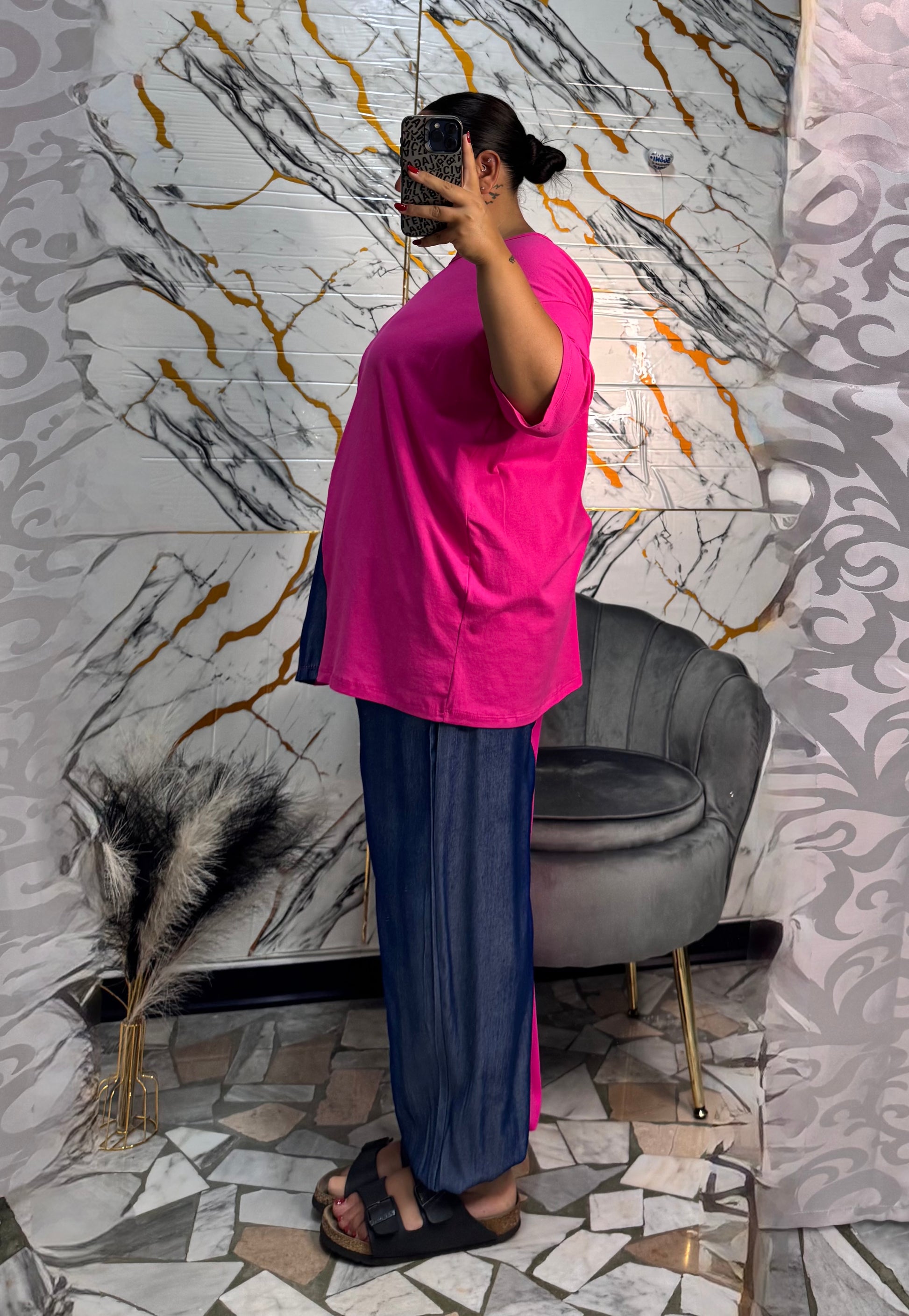 - Maglia: maxi t-shirt fluo con applicazione in denim sul davanti, che crea un effetto patchwork originale e super trendy