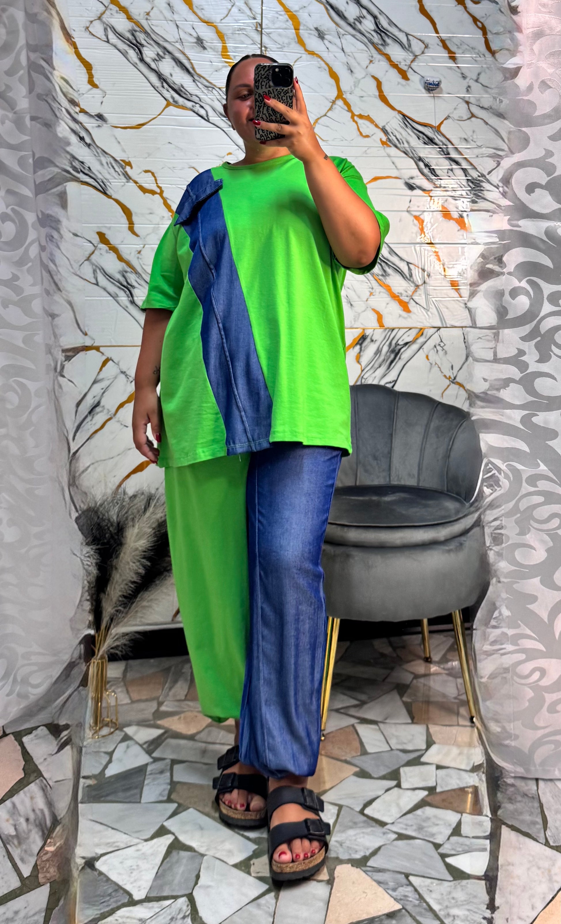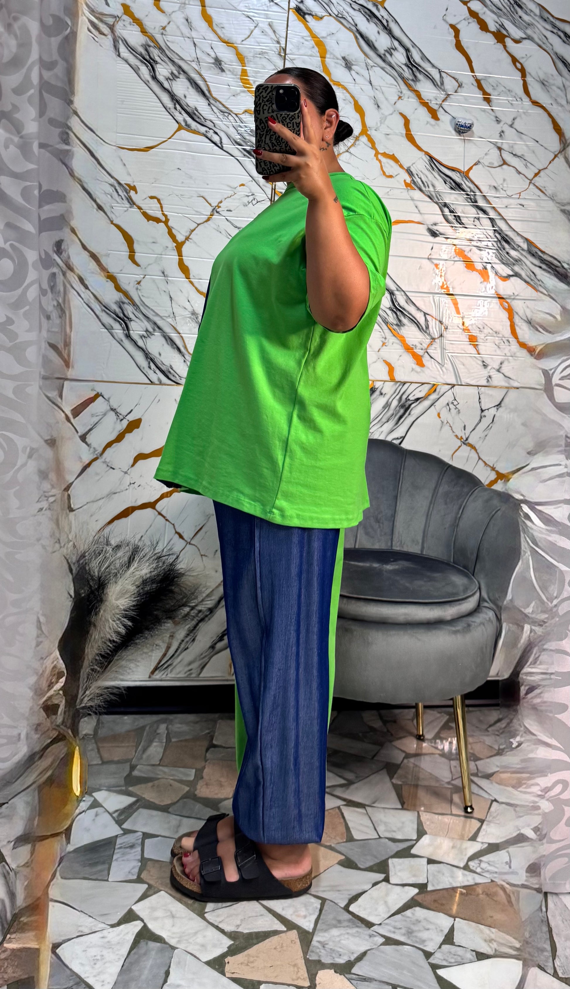 - Pantalone: gamba dritta con design bicolore, metà verde e metà denim, perfetto per slanciare e dare carattere all’outfit